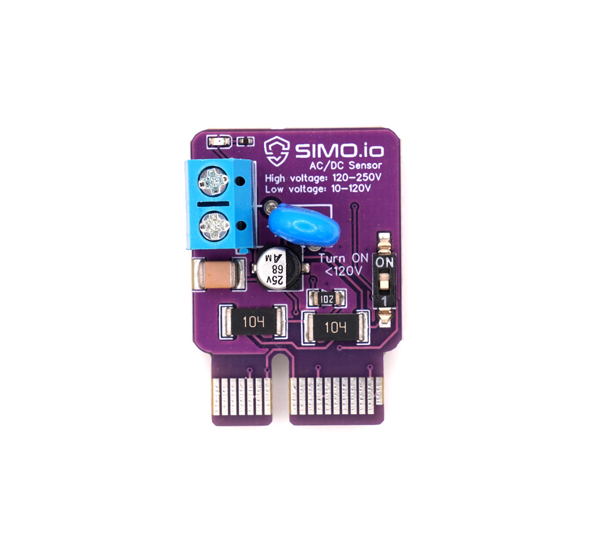 The AC/DC Sensor is a two‑terminal, optically‑isolated detector that reports a logic HIGH to your Game Changer board when voltage is present across its input. It is non‑polarized (works with AC or DC) and shares the same snap‑in form as other SIMO.io modules.