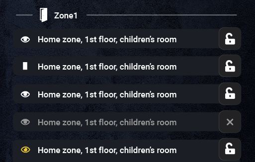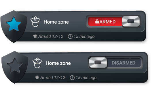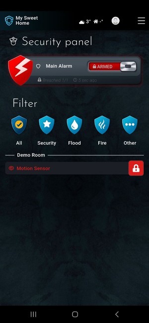 A dedicated Security panel manages everything. One tiny lock at the very top of the app mirrors your main alarm group: locked (armed), unlocked (disarmed), or flashing red (breached). - Professional by default